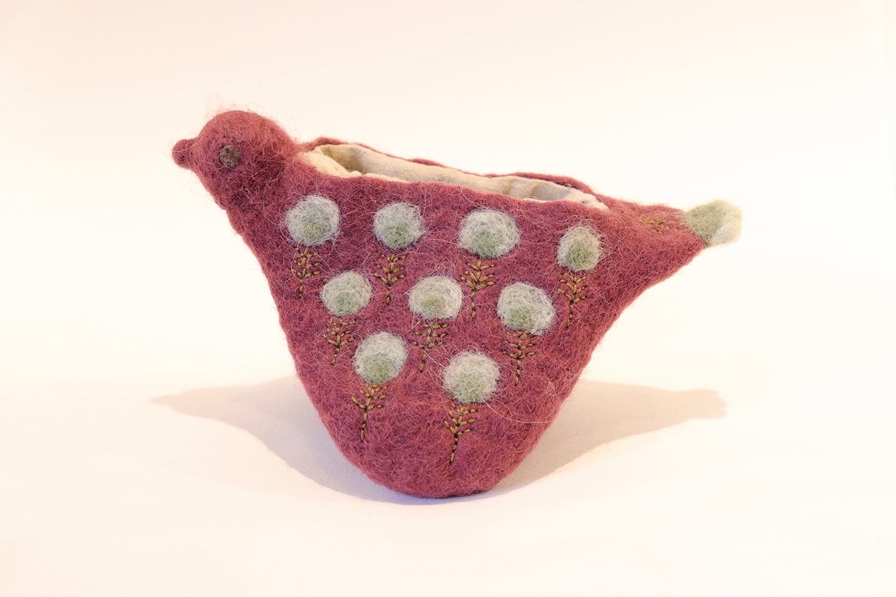 ワイン色は染料で、緑色は玉ねぎの皮で染めた羊毛を使いました。また羽の部分は孔雀の羽のような、お花のような模様にしました。羊毛は水を弾くので実際に使うと想像よりも汚れにくいと思います。